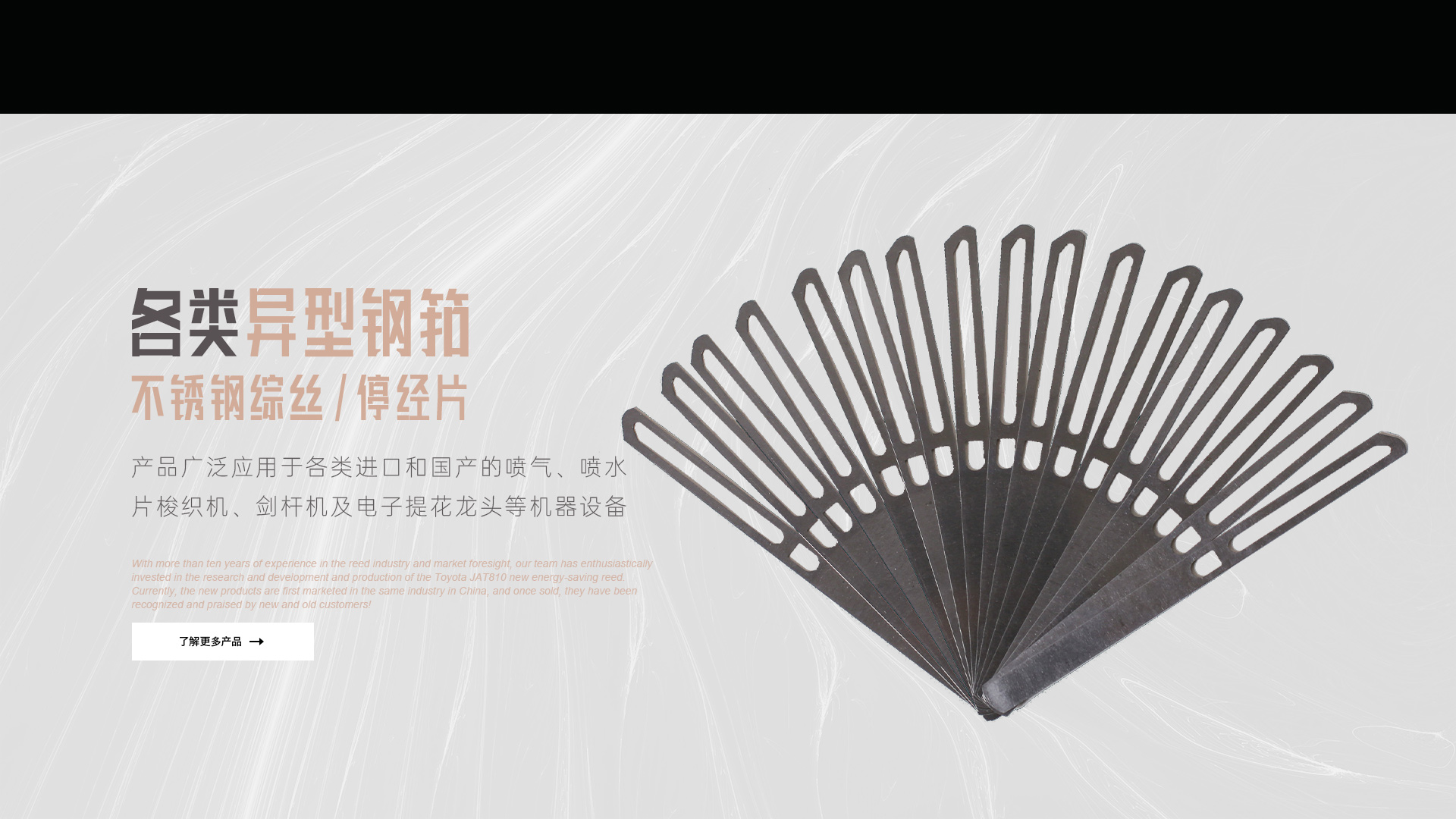 公司主要產(chǎn)品有:噴氣織機(jī)用各類異型鋼筘(傳統(tǒng)型豐田JAT710鋼筘及新研發(fā)的豐田JAT810節(jié)能筘);不銹鋼綜絲及不銹鋼停經(jīng)片。我們的產(chǎn)品廣泛應(yīng)用于各類進(jìn)口和國產(chǎn)的噴氣、噴水、片梭織機(jī)、劍桿機(jī)及電子提花龍頭等機(jī)器設(shè)備。